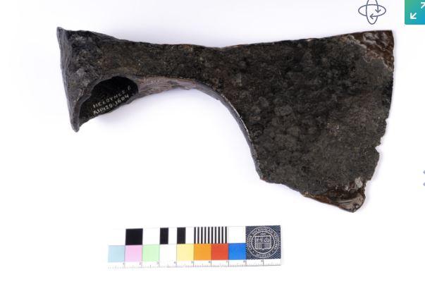 An iron axehead with triangular socket, narrow blade with curved edge with beard section.
