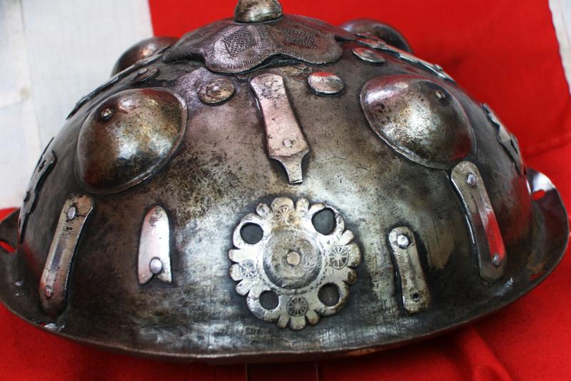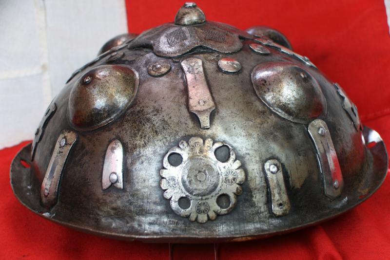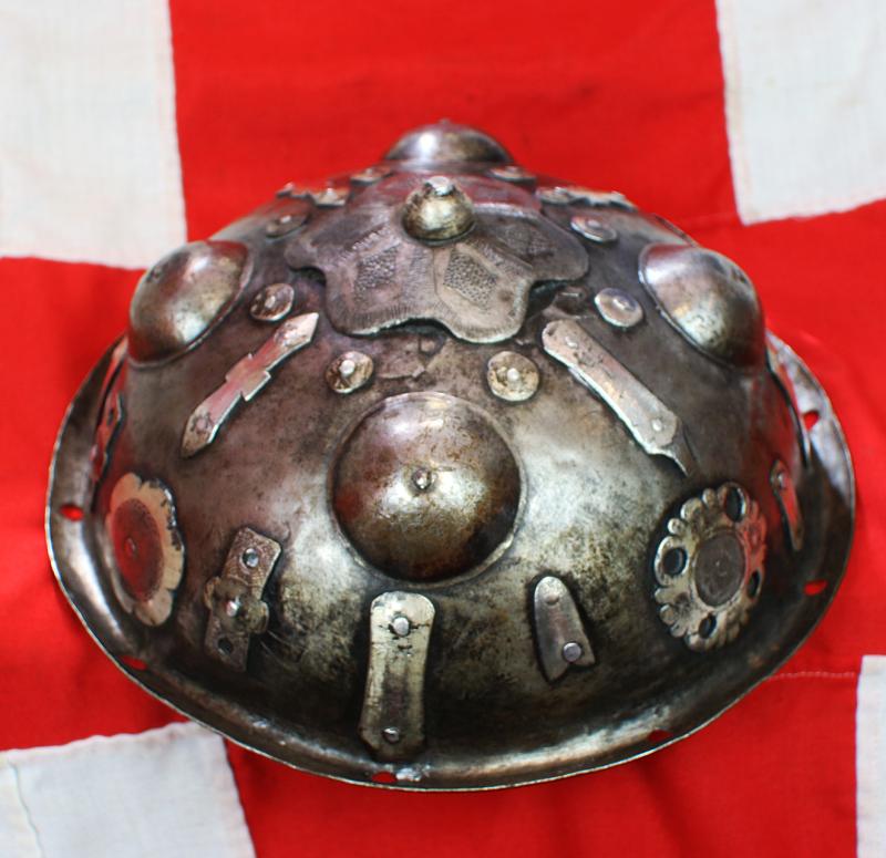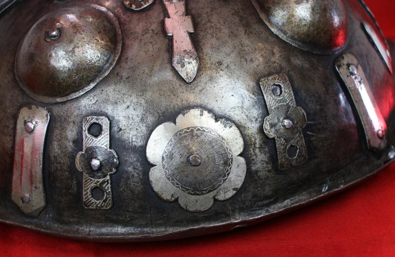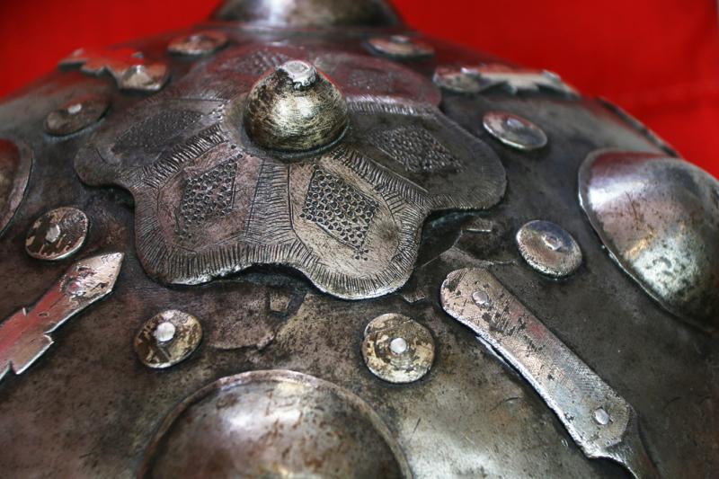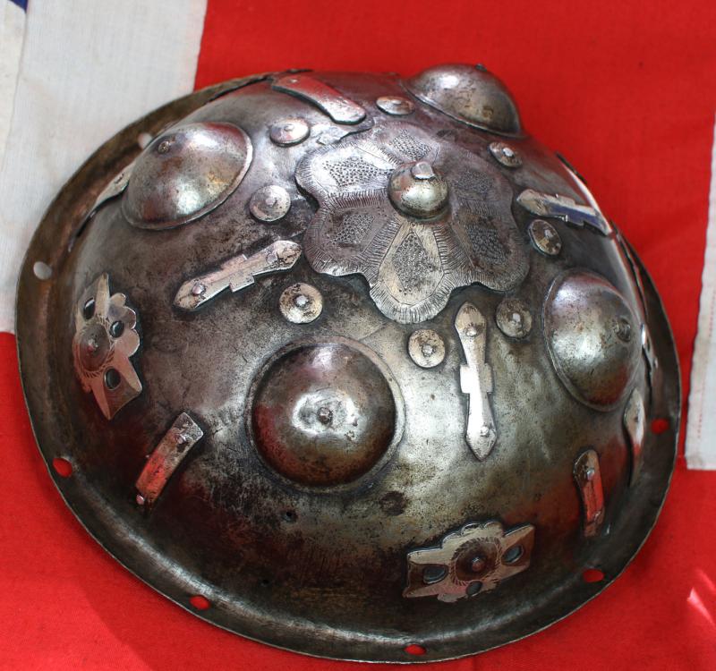 Just returned from over 40 hours of specialist hand cleaning and polishing with final conservation . This Indo-Persian Dahl is a circular, convex shield used in military combat or as an ornamental item, originating from the Indian and Persian regions. This shields, also known as Sipar, were typically made from steel or leather and were adorned with elaborate floral designs, often using koftgari (gold and silver inlay), and featured four domed bosses.