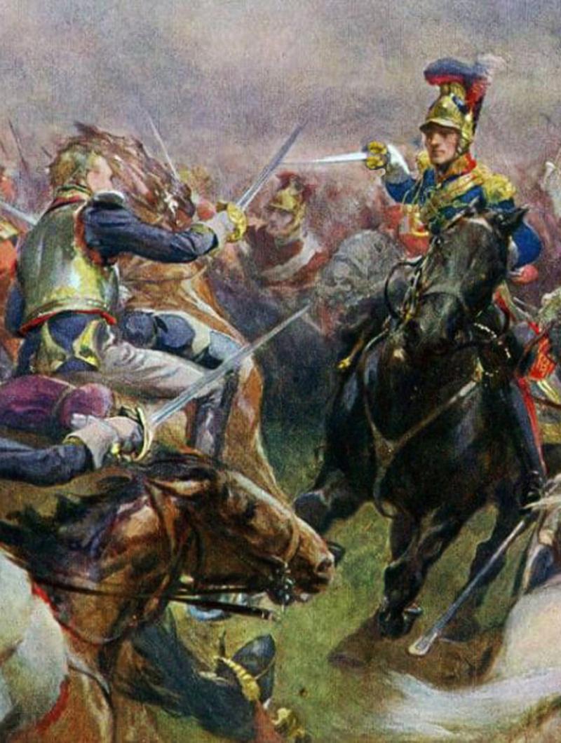 "Ces terribles chevaux gris! Comme il travaillent!" (Those terrible grey horses, how they strive!) At approximately 1:30 pm, the second phase of the Battle of Waterloo opened. Napoleon launched D'Erlon's corps against the allied centre left. After being stopped by Picton's Peninsular War veterans, D'Erlon's troops came under attack from the side by the heavy cavalry commanded by Earl of Uxbridge including Major General Sir William Ponsonby's Scots Greys. The shocked ranks of the French columns surrendered in their thousands. During the charge Sergeant Ewart, of the Greys, captured the eagle of the French 45th Ligne. The Greys charged too far and, having spiked some of the French cannon, came under counter-attack from enemy cavalry. Ponsonby, who had chosen to ride one of his less expensive mounts, was ridden down and killed by enemy lancers. The Scots Greys' casualties included: 102 killed; 97 wounded; and the loss of 228 of the 416 horses that started the charge. This engagement also gave the Scots Greys their cap badge, the eagle itself. The eagle is displayed in the Royal Scots Dragoon Guards museum in Edinburgh Castle. The British Heavy Cavalry, during the Peninsular War and at Waterloo it fought with incredible distinction and exemplary bravery, and saw some of the most incredible and courageous combat. Fighting the elite French Curassiers and Carabiniers of Napoleons Imperial Guard was no mean feat, for at the time the French Cavalry was some of the most formidable in the world, and at their very peak. Never again was the French Cavalry to be as respected and feared as it was during the great Napoleonic era. Some of the battles this may also have been used at were; during 1808-14 The Peninsular Campaign, including, Salamanca , Toulouse, Albuera Talavera, Pyrenees then from 1814: La Rothiere, Rosnay, Champaubert, Vauchamps, Athies, La Fere-Champenoise and Paris