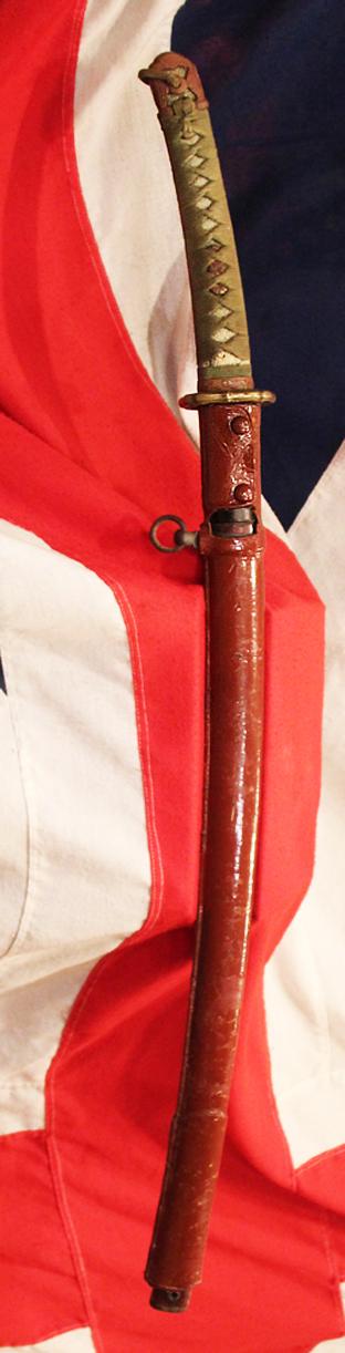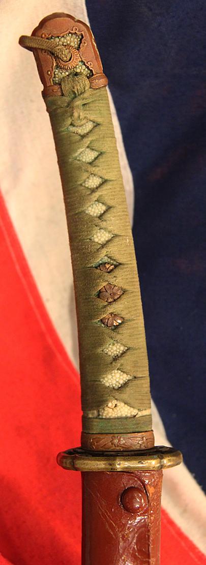 Notable for the strongly relieved shinogi-ji and o-kissaki, the Unokubi-Zukuri provides excellent balance in a strong cutting blade. The mune (back) of the blade is also different from the more usual form in that it starts out like most blades, but after a third of the way down, the mune thins out rapidly into a long thin false edge. It has two hi from the habaki on one side and a wide single hi on the other. Silver foiled habaki. It has its original, antique, Edo period saya, decorated in cinnabar colour lacquer with buffalo horn kurigata, beneath a combat leather cover, typical for the World War 2 period.
