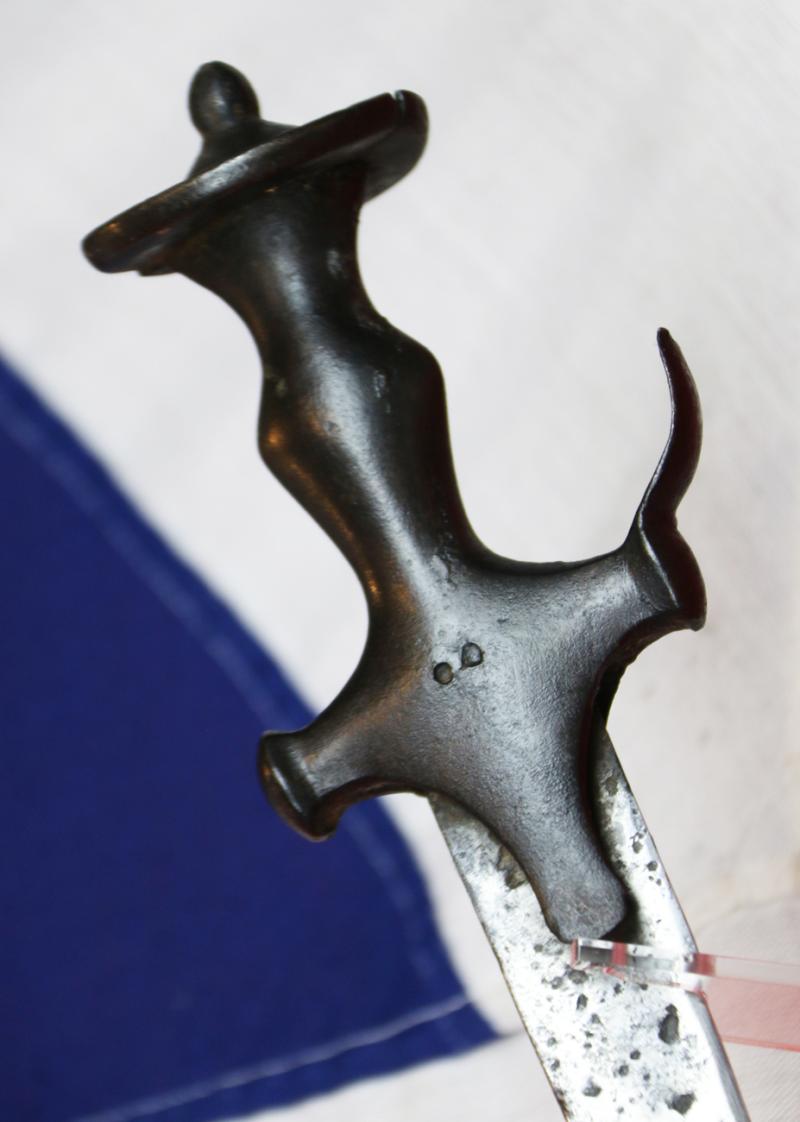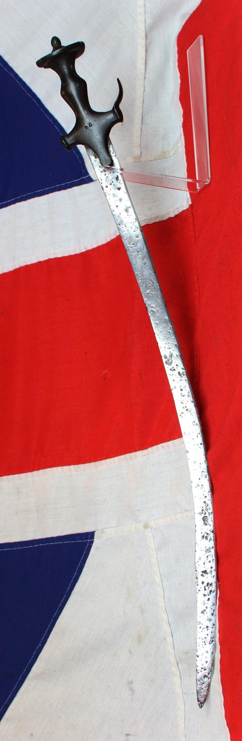 Gifted to the family by Irish born Capt. H.G.Browne {later Colonel of the 100th Foot} who died just before WW1 and was buried near his home on the Isle of Wight. A very early tulwar, and the blade was deeply pitted through great age even before the siege, but the hilt was damaged during the siege and battles at the Lucknow defences, very likely by a cannon shot as the impact seems too drastic and singular to be by musket fire, or by simple hand to hand combat. Very bright polished blade, and a nicely black patinated hilt. Perfect for an intriguiging historical collection or display.
