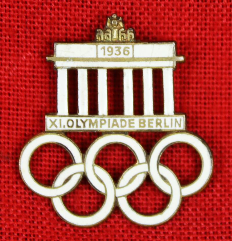 Genuine official visitors badge, depicting the brandenberg gate and the Olympiad five rings, from the pre WW11 Olympic Games ,1936, which were intended to promote Aryan ideals. It is made from gilded metal with white enamel decoration. The badge is marked on its face ''Xl Olymiade Berlin 1936'' and on the rear Ges Gesch with a makers mark. Condition is very good in line with age and use with very light surface wear, no loss of original enamel gilt etc.