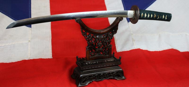 20.3 inches overall in saya, 13.5 inch blade tsuba to tip blade Overall in very nice condition, natural aging wear to the tsukaito, usual age wear to fuchigashira. Saya and blade excellent.