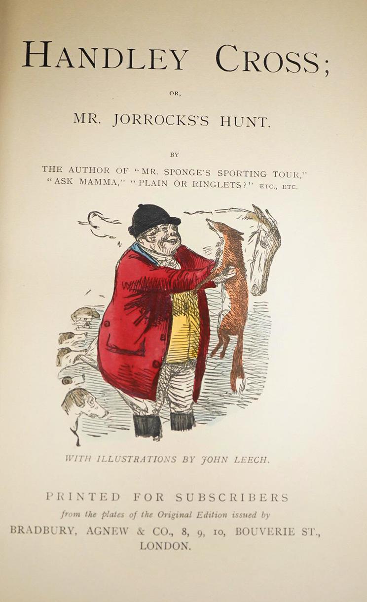 Surtees,R.S - Sporting Novels, subscriber's edition, full leather deluxe binding in red calf, 6 vols. hand coloured title vignettes and num. hand coloured plates (by John Leech & H.K. Browne, aka. Phiz); contemp. gilt pictorial, decorated and ruled red calf, panelled spine.