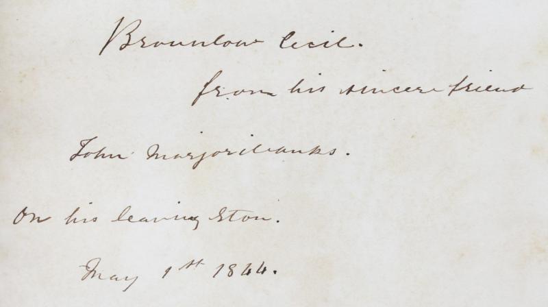 Presented to Colonel Lord Brownlow Thomas Montagu Cecil {Colonel of the Scots Guards} in 1844 upon his graduation from Eton, by John Marjoribanks