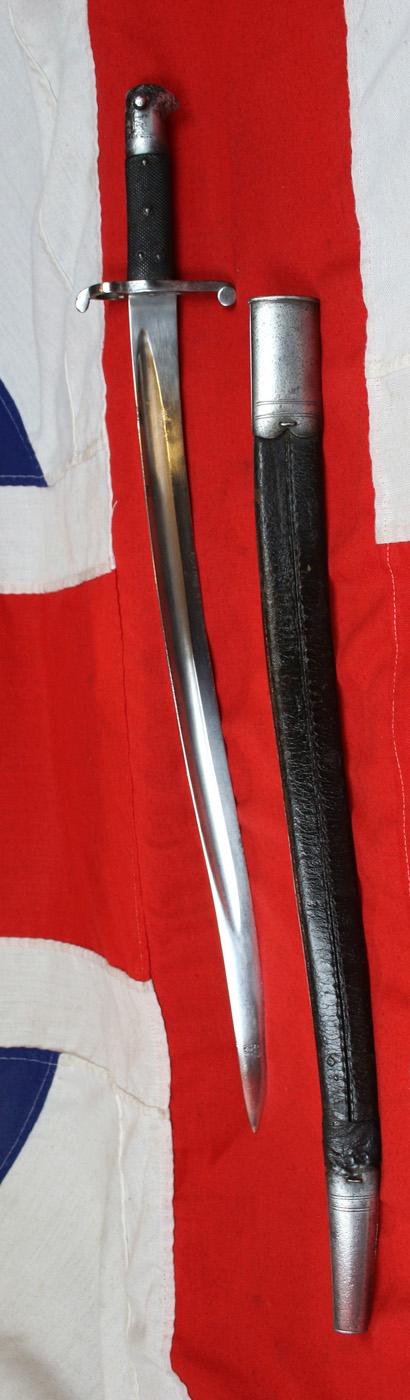 The rifle that this sword bayonet was designed for the P1853 two band Enfield rifle, and was first used in the late Indian Mutiny at the "Seige and Relief of Lucknow". With a chequered leather grip with rivets, and screw affixed retaining spring. Good, long, Yataghan blade in bright polish. Excellent leather.