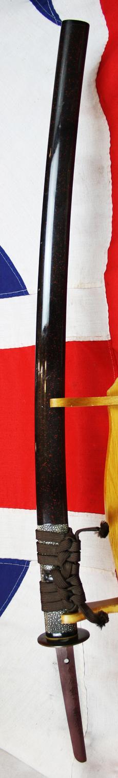 A very good WW2 Japanese officer's sword in superb polish showing a very fine notare midare hamon with great activity, and, in superb condition, the habaki {blade collar} is it's deluxe, traditional, hand made example, gold coated, from the 1930's to 40's. This sword was remounted after the war, in the traditional samurai katana manner, with antique and vintage fittings. The Edo period shakudo tsuba is a particularly nice example. A simple style but sophisticated in its simplicity. Its traditional lacquer saya is also most attractive, with its giant rayskin top section decor, and showing very fine post war workmanship. The price shown includes the cost of restoring the tsuka binding.