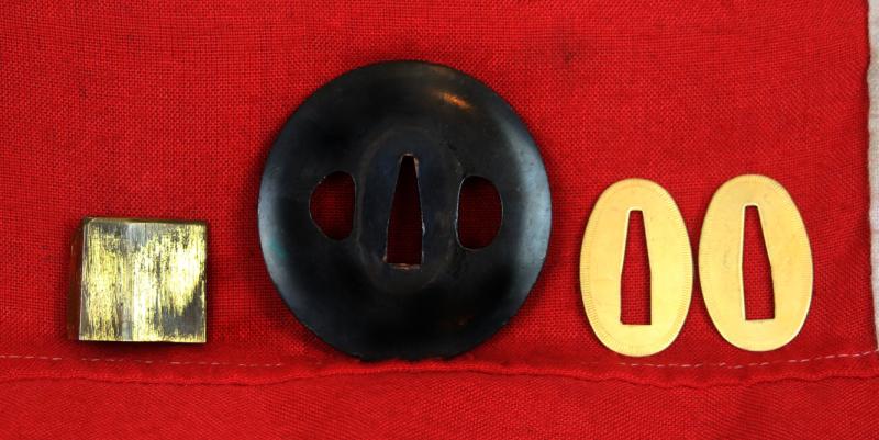 The tsuka-ito {hilt binding} was too aged to save, so we are having the tsuka {hilt} rebound. Once refitted upon the sword, we will add further photographs