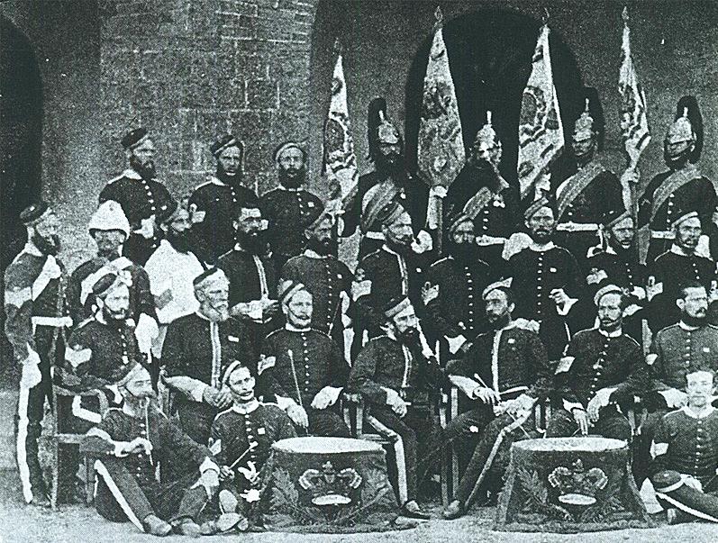 The Bays were in Dublin when the Mutiny broke out in India. They were ordered to Liverpool, then on to Canterbury where one Troop was left behind. They embarked 9 Troops under the command of Lt-Col Hylton Brisco, with a strength of 28 officers 47 sergeants and 635 other ranks. They sailed on 25 July on two transports, the Blenheim and the Monarch. The voyage was a long and arduous one for the officers and men on the overcrowded transports. The only land they sighted before reaching India, was Madeira, where they lay becalmed for 28 days. This increased their journey to 141 days. During that time they were daily rationed to 1 lb of very hard biscuit, 12 oz of salt meat, a small quantity of tea and sugar, and 5 pints of water. Washing had to be done in sea water. After 3 months at sea they were told that they were only half way there and rations had to be halved. One of the Bays described the lack of appetising food: 'On Sundays, boulle soup was given for a change, but it wasn't generally approved of, as one mess found a dead mouse in theirs, and another mess found a man's finger with a rag wrapped round it.' They reached Calcutta to find that the KDG had arrived a fortnight before, having set off a month later than them. All of them suffered sickness for 4 or 5 days after disembarkation.