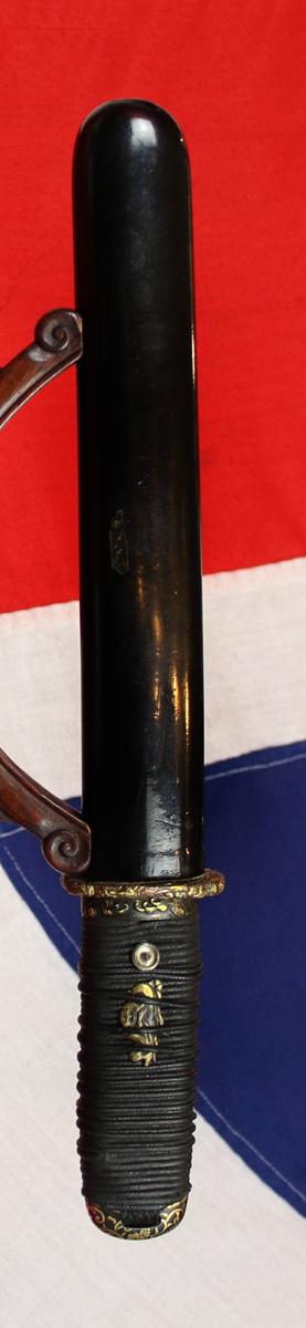 With cord bound hilt, over patinated copper metal figural mounts, gold inlaid pommel in a aoi leaf and vine patterning, gilt highlighted nicely chiselled iron sword guard, silver foil covered blade collar and single edged damascened blade.The whole design is very much in the Japanese taste, but with a Chinese form fixed hilt, unlike the Japanese dagger hilt which is removable. Black lacquer scabbard.