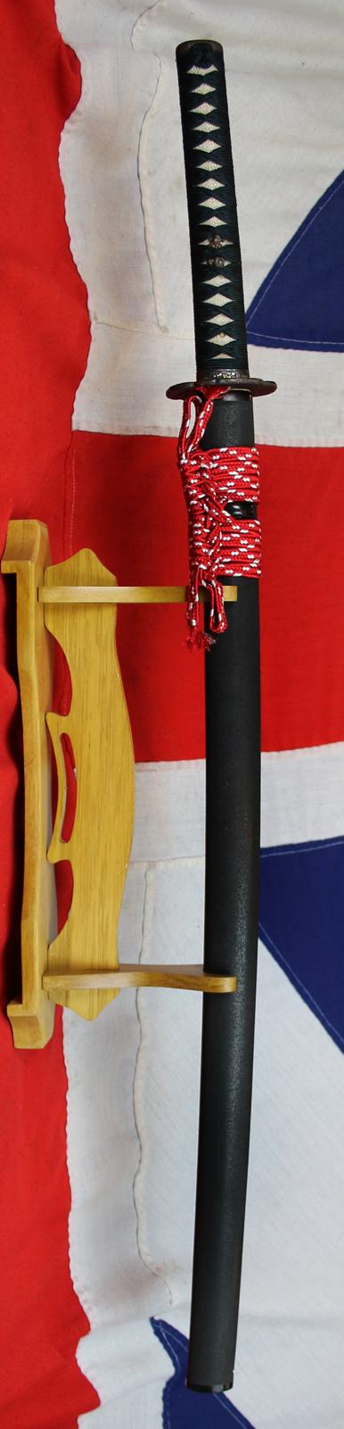 A large iron plate mokko tsuba with mimi, decorated with a village scene with gold highlights. the fuchi kashira are matching with a rattan screen pattern showing gold decorated blooms. a superb black isheme stone finish saya, and finest black tsukaito binding wrapped over fine menuki, and traditional samegawa {giant rayskin}.