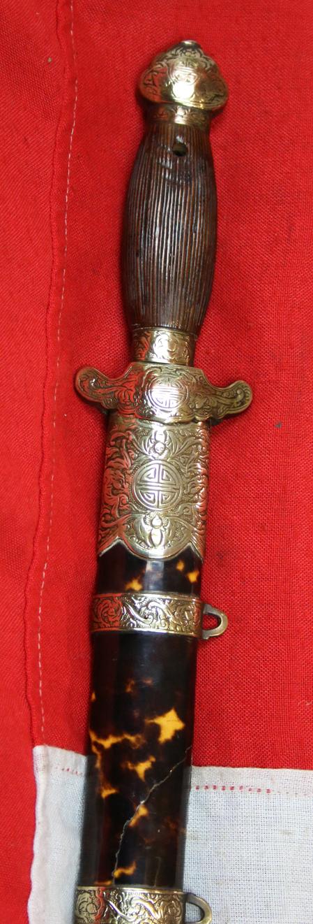 A Chinese jian sword, double edged blade lined darkwood grip, tortoishell covered scabbard, with typical stylized brass mounts, typically decorated with a traditional, intricate, bat and seal design. Double edged blade. Overall with stunning original patination that has been now revealed. It has just returned from ten hours of museum grade hand conservation and polishing.Thanks to such extraordinarily successful efforts, this would be a Chinese antique sword that would unlikely be to improve upon.