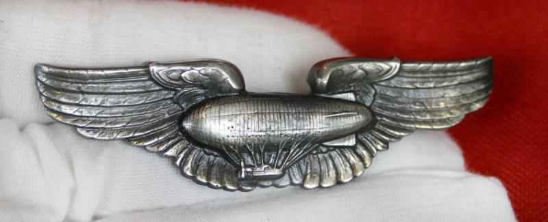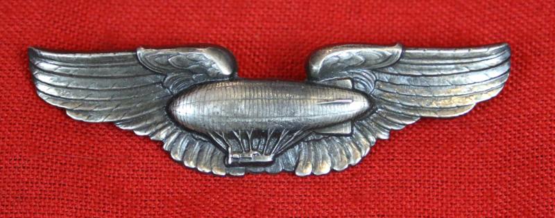 This is an excellent example of an Airship Pilots Wings from the early 1930’s. The wings were relatively short-lived, being authorized in Oct of 1921 and abolished in 1940. When the Airship Pilot wing badge was first introduced in October 1921, the airship image seen on it was actually patterned after the U.S. Army RN-1. The RN-1 began life in 1919 as the French built Navy Zodiac ZDUZ-1 and was acquired by the Army that same year. It was extensively modified with a new envelope in 1923 built by Airships Inc. with stronger and lighter tail surfaces built by Wittemann-Lewis Aircraft Co.