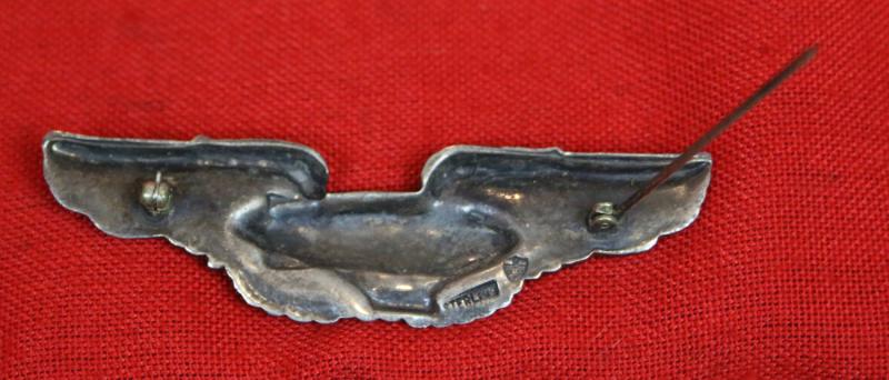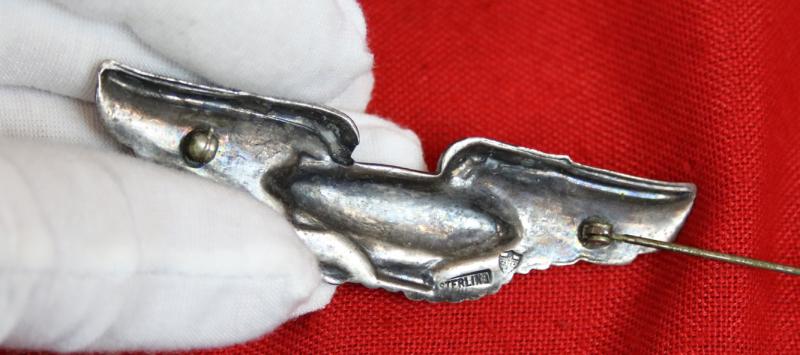 The wings measure just over 3” across and are made of a single struck design. Most of the original plating has been retained and the artwork is still very easily recognizable. The back is “hollow” and the N. S. Meyer "Shield" hallmark and STERLING can be found on the right wing {looking from the back}.