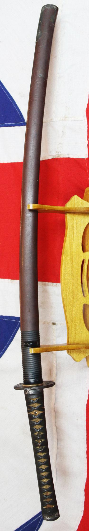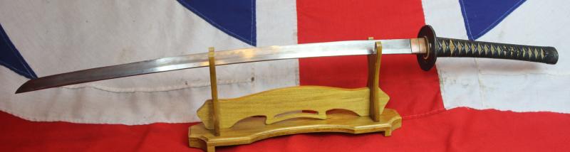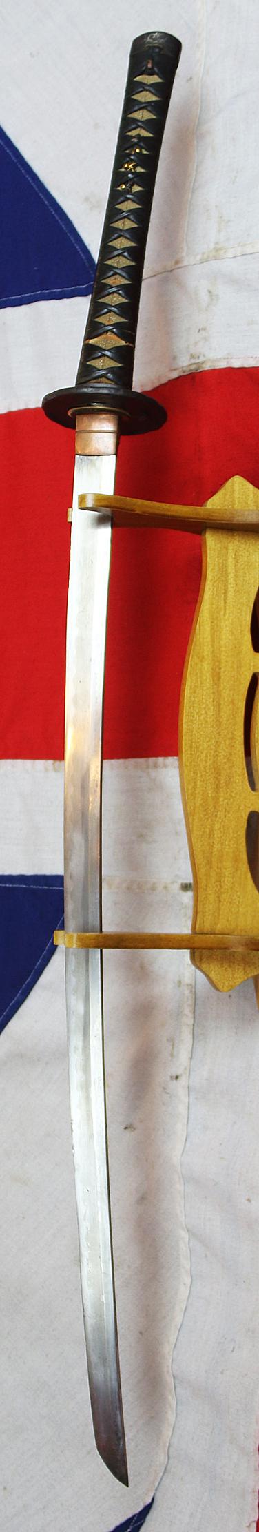A beautifully impressive and long ancient samurai sword, worthy of a museum quality display, with a stunning Koto blade that has an amazing gunome hamon, has just been photographed 'as is' at present, and it is most grubby, as it was coated in antique protective lacquer around 170 years ago. We are having this removed and in the next few days it will return and look fabulous, as it last did 170 years ago, before it arrived in England from Japan, as a honorary gift from a member of the Japanese nobility. It is fitted with a very fine, large iron kachimushi decorated iron tsuba.