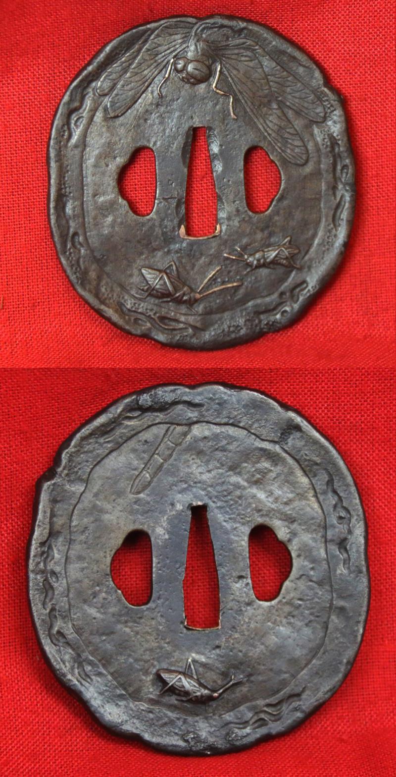 It has a very rare menuki of suzumebachi, giant hornets Vespa madarina Japonica, in pure gold overlay and shakudo, a subspecies of the world's largest hornet, with a wingspan of 2.4 inches. Giant hornets give spiritual protection for the sword. Stunning tsuba of a large tetsu ovoid plate tsuba with takebori dragonfly with gold legs, and crickets with gold antennae. Fuchi kashira in tetsu with silver inlays of vine tendrils.