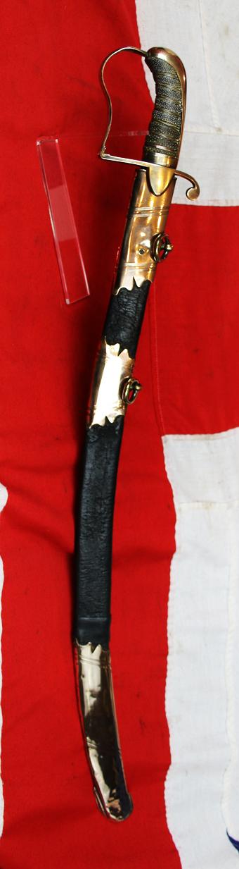 Regulation broad curved single edge blade engraved with traditional crowned GR, and the Kings’s Hanovarian 1801-1816 coat of arms, with military scrolls and symbols engraved decor, copper gilt stirrup hilt, excellent wire bound fish skin covered grip, in its original copper-gilt mounted leather scabbard, commissioned maker engraved at the throat mount, by its esteemed London sword cutler. Interestingly this is the very pattern of Officer’s sabre, {the 1796 copper-gilt mounted sabre} that inspired the creation of the 1803 pattern infantry officer’s sabre. The 1796 pattern infantry sword was considered by some to be inefficient at cutting down a foe in combat, but the sweeping mighty curvature of the 1796 cavalry sabre was apparently just the ticket for the more ‘derring-do’ officers, with an appetite for ‘gloire du combat’, so a version was created in copper-gilt, just like this sabre, but with an entirely new form of robust infantry hilt, more closely resembling this cavalry form. Thus it had demonstrably more force for hand to hand combat, yet still gloriously beautiful, with its stunning copper-gilt mounting.