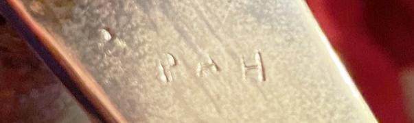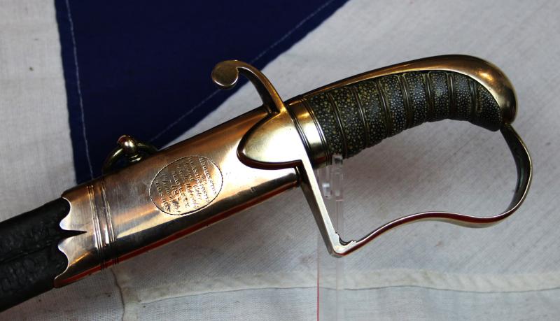 Good leather to the scabbard with one contemporary field service leather patch and a small, makers craftsman, repair. Copper gilt hilt, of much elegance and beauty, with superb original sharkskin grip, in near mint order, triple wire bound, and copper-gilt mounted scabbard with usual light surface combat wear and denting. The bright blade is simply excellent with just a few old, original, surface pitting marks. The last photo is of a close-up from the interior guard of the cutlers applied, owner's, small 'repair' monogram, PAH, likely applied when the leather was repaired. Somewhat akin to an old 19th century pawnbrokers mark on the inside of a gold pocket watch, in order to assign the item to its owner {to avoid miss placement} but, unobtrusively as possibly. The tiny stamp is almost nigh near invisible, but, clearly viewable with a powerful artisan jewellers loop {magnifying glass} See photo.