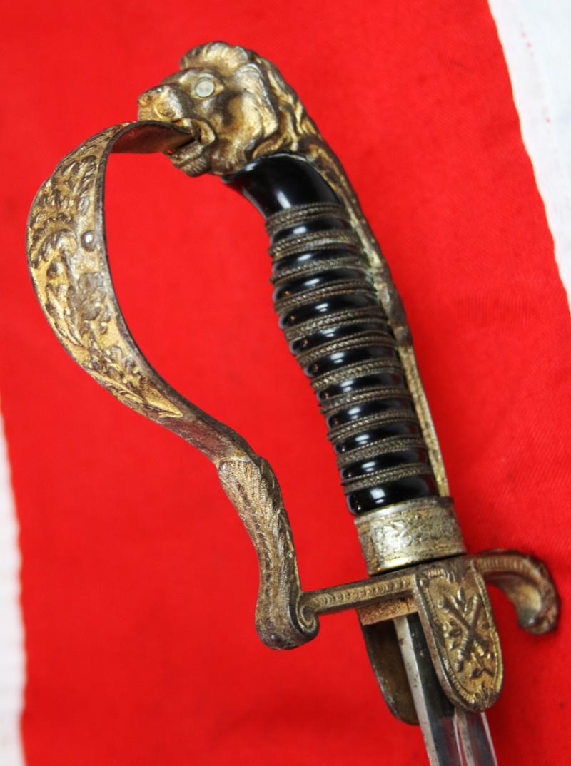 A Good Imperial German Artillery Officer's Sabre With Deluxe Lion Head Pommel Hilt, Lioness Quillon End and Embossed Oak Leaf & Acorn Pattern Design Throughout With Crossed Cannon Quillon.