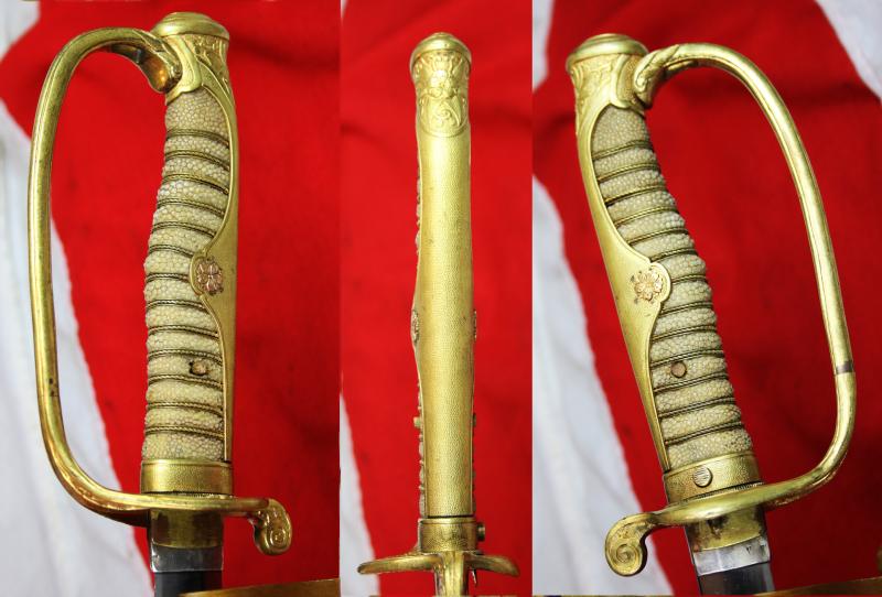 Three photos in the gallery {numbers 7,8,9,} of Admiral Togo with his Kyu-gunto mounted ancestral sword, with the Russo Japanese war service scabbard, and photo number 10 with a WW2 Japanese officer with his Kyu-gunto sword but its WW2 service saya {scabbard} like this one.