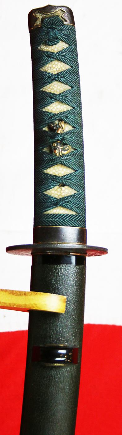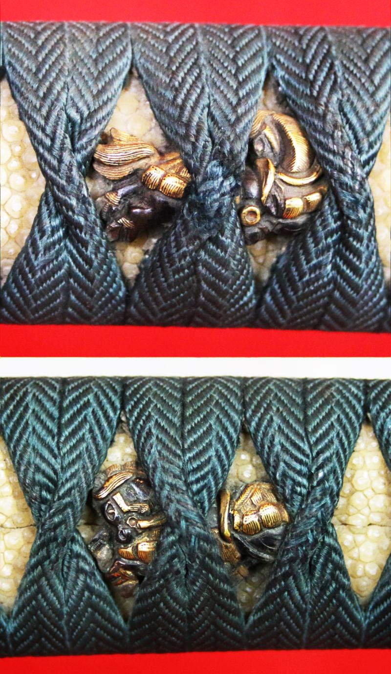 Picture 7 in the gallery is of the tsukaito over the war pony menuki. They appear to difference shades of green, but this is an illusion created by the camera photo light. There is no actual difference in colour at all