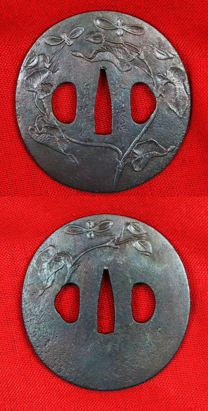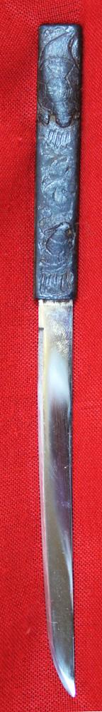 The kozuka, side knife, has a Higo school iron handle depicting two Minogame turtles, particularly the minogame (straw-raincoat turtle), represent wisdom and are said to live so long that algae grows on their shells, resembling a tail.