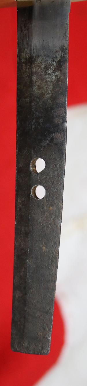 Overall this sword is is superb condition, all the handachi mountings are original Edo period, as is the saya and its urushi ishime lacquer. The tsuka-ito has a geometric weave pattern, and also original Edo period. The delightful Edo tsuba is iron, with a relief Aoi leaf pattern, and signed. The pair of Edo menuki are pure gold over shakudo of deep takebori samurai war ponies in fully saddled riding tack, without riders..