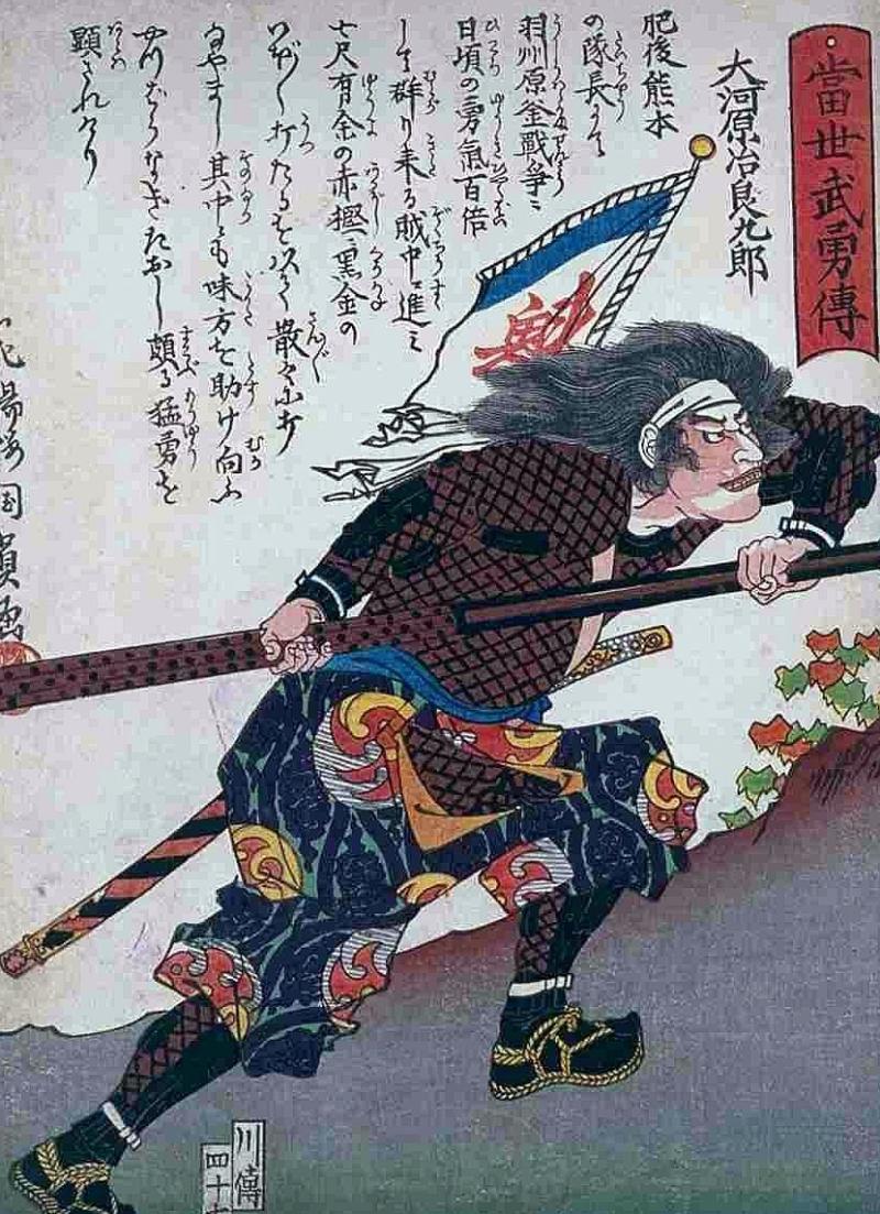 Two woodblock prints in the gallery of samurai in combat wearing kusari chain mail armour