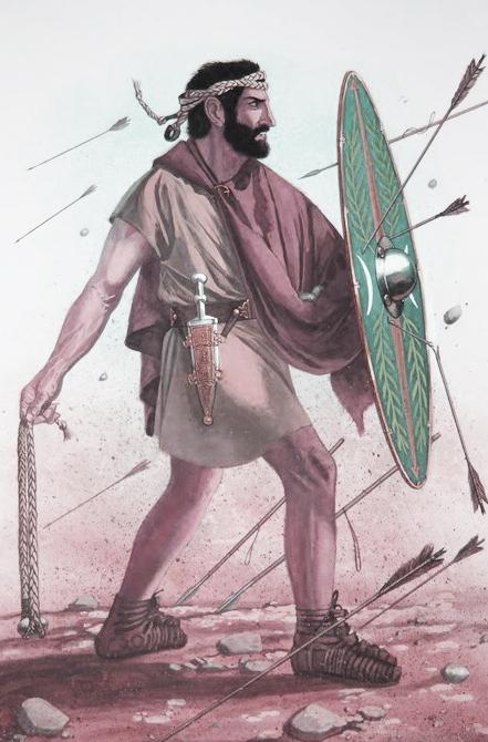 Slingers wore three slings. A large one tightened to the waist (to be used in distances of more than 60 metres.), a small, one tightened around his forehead (range 20-25 metres.) and a medium size one always on the hand (with a range up to 60 mts.). They carried the bullets in a goat fur bag hanging from the shoulder. With the large one they could launch 500 grams stones (like a tennis ball) that were able to destroy shields and wood defences. With the small and medium size slings the lead bullets could perforate at short distances (up to 60 metres.) thin armours and helmets. The sling as a weapon was widely used not only by Balearic warriors but by other Iberian warriors and also by Roman auxiliary troops like Greeks, Sicilians, North Africans, but after the Roman conquest of the Balearic Islands elite slingers were always the Balearic that fought in the legions of Julius Caesar. Bullets are usually found on the known battle fields of the Roman conquest.