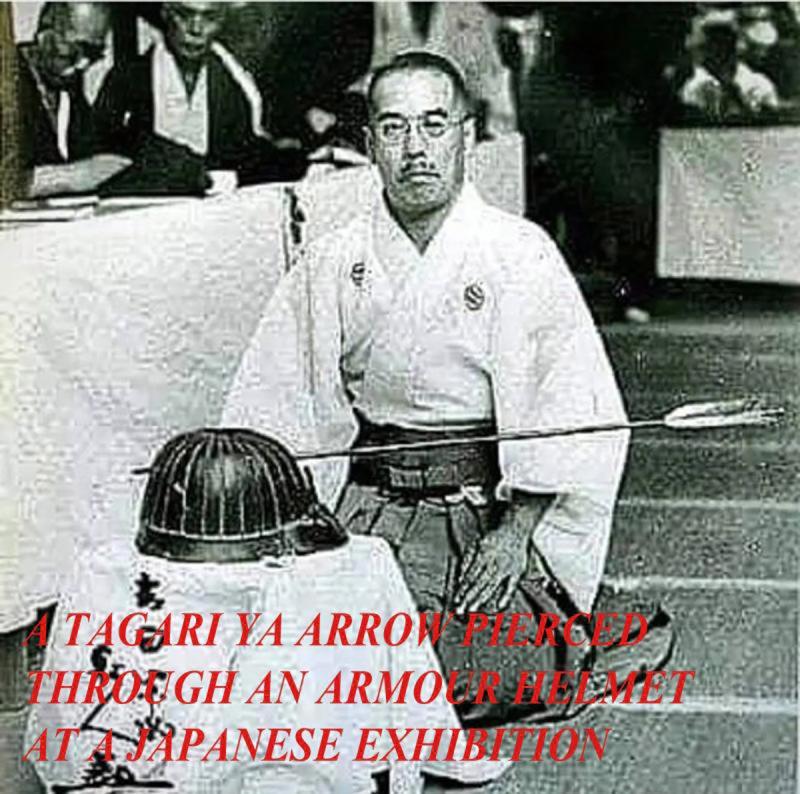 Mock battles were staged, sometimes as a show of force to dissuade enemy forces from attacking. While early medieval warfare often began with a formalized archery contest between commanders, deployment of firearms and the constant warfare of the 15th and 16th centuries ultimately led to the decline of archery in battle. In the Edo period archery was considered an art, and members of the warrior classes participated in archery contests that venerated this technique as the most favoured weapon of the samurai. In the gallery is from an Edo exhibition of archery that shows a tagari ya arrow pierced completely through, back and front, an armoured steel multi plate kabuto helmet. Another photo shows an unmounted arrow head with the considerable length of the tang that is concealed by the haft.