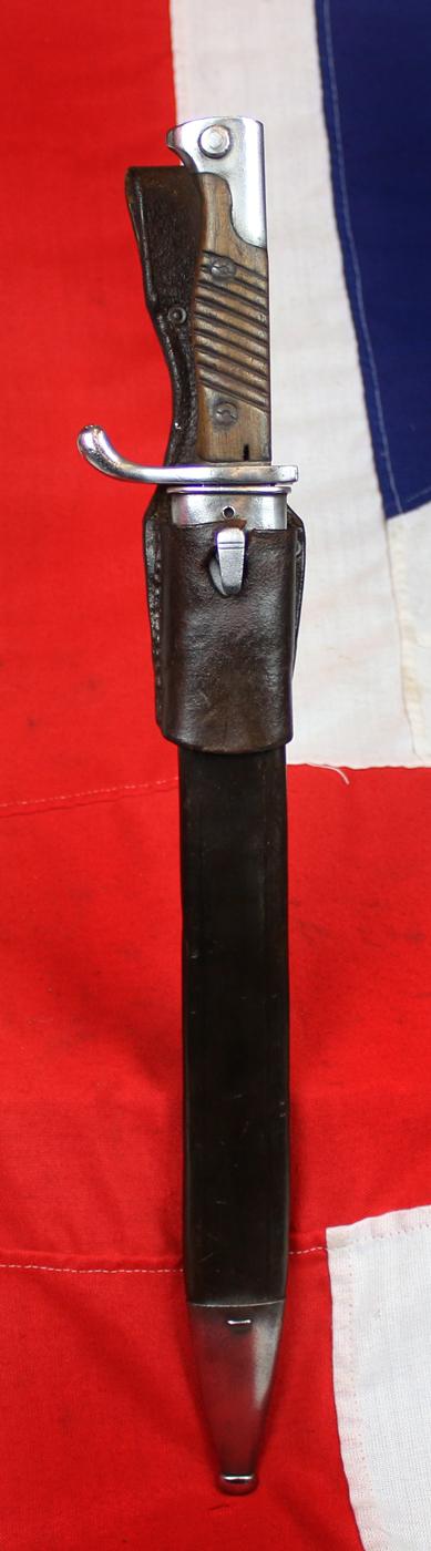Designed to fit the Mauser Gew 98 rifle. The Seitengewehr 98/05 was introduced into the the Prussian army in late 1905, as a replacement for the 98/02 for engineers and pioneer troops, as the 98/02 was deemed to long and heavy for it's intended purpose. Initial production was in two versions, the first plain backed, and the second with 29 double teeth. The earliest scabbard was leather with steel throat and chape mounts, later changed to all steel that was better for trench warfare combat. The bayonet as typical of German blades did not have more than a vestigial muzzle ring, relying on the length of the hilt mounting to fix the blade to its rifle. The plain back version was identified as the S98/05 or S98/05 o.S. (ohne Sage - without saw) and the saw back as the S98/05 S or m.S. (mit Sage - with saw).
