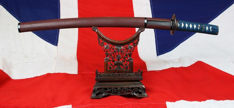 A Good Yoshii School Wakazashi, Likely Muromachi, Signed Yoshii Mitsunori Dressed With A Stunning Livery of Brown Ishime Lacquer Complimented With a Finest Blue Silk Tsukaito Hilt Wrap