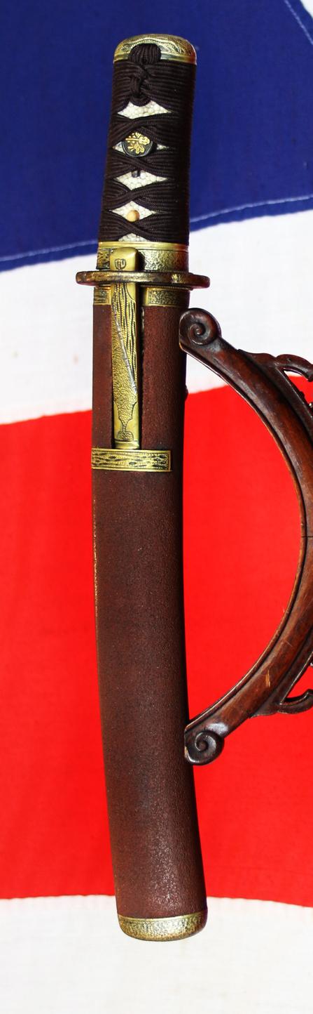 The kozuka and kogai pockets in the saya are lined with delicate, doe skin, decorated with a black and red pattern, on a natural white skin ground, in the same form as can see seen to embellish kabuto and armour {see photo 8 in the gallery}.