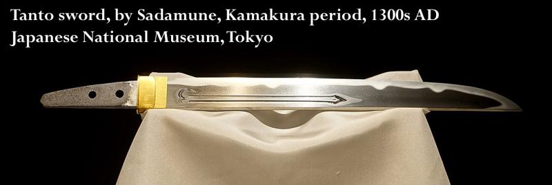 Photo in the gallery of a Tanto sword, by Sadamune, Kamakura period, 1300s AD - Tokyo National Museum - Ueno Park, Tokyo, Japan. This shows how their samurai swords are displayed in the greatest Japanese museum in Tokyo. The koshirae {fittings} are always shown separately, if at all.