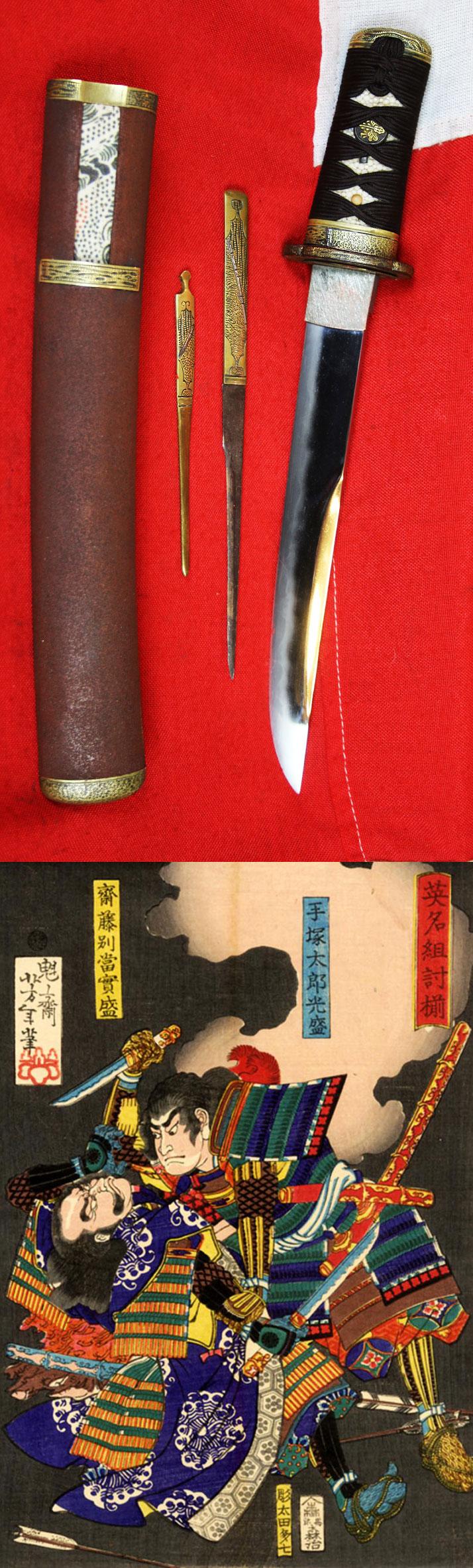 A Truly Beautiful Antique Koto Period, 'Dragon Head' Hamon, Unokubi (鵜首) Zukuri Blade Tantō. In a Chesnut and Sable Livery, Matsushiro Sinano Koshirae With Kozuka and Kogai, with Higo Scool Tsuba Inlaid With Pure Gold Sakura {Cherry Blossom}