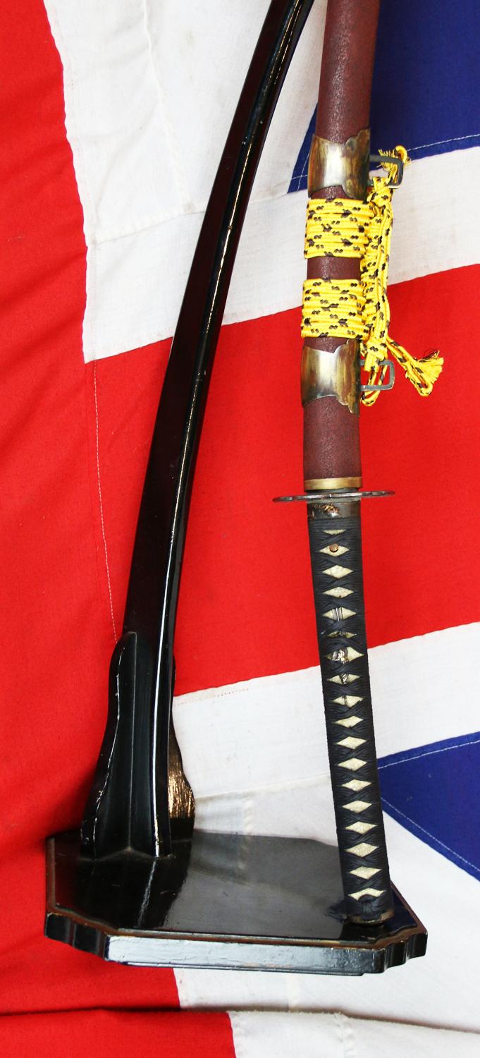 This wonderful sword is photographed in the gallery not only displayed on a traditional katana stand {horizontal}, but also on a black lacquer, old, traditional tachi stand { tachi-kake, more vertical}. The sword with come complete with a complimentary katana stand. The tachi stand is sold separately.