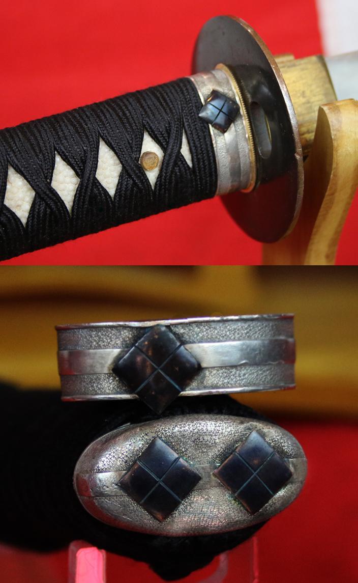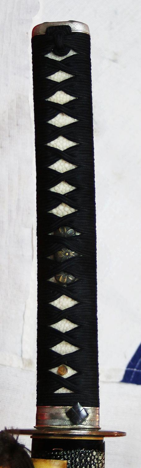 The tsuka-ito {hilt binding} is in stunning black, with chrysanthemum Hirohito menuki, over traditional samegawa, and the fuchi kashira are beautiful antique silver, with the shakudo clan mon, of the Takeda-bishi 武田菱, of the highly esteemed Takeda clan.