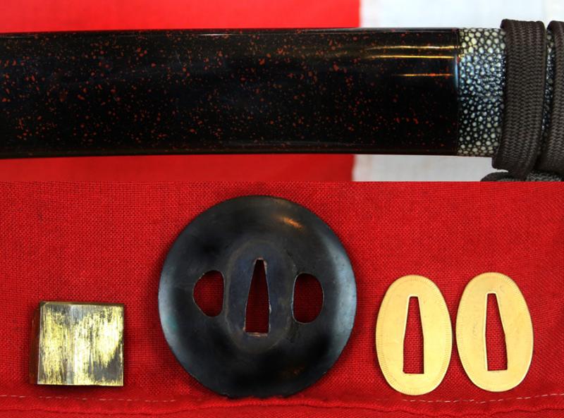 This sword is beautifully mounted, in the traditional samurai katana manner, with Takeda clan antique and vintage fittings. The Edo period shakudo tsuba is a particularly nice example. A simple style but sophisticated in its simplicity. Its traditional lacquer saya is also most attractive, with its giant rayskin top section decor, and the saya is showing very fine workmanship.