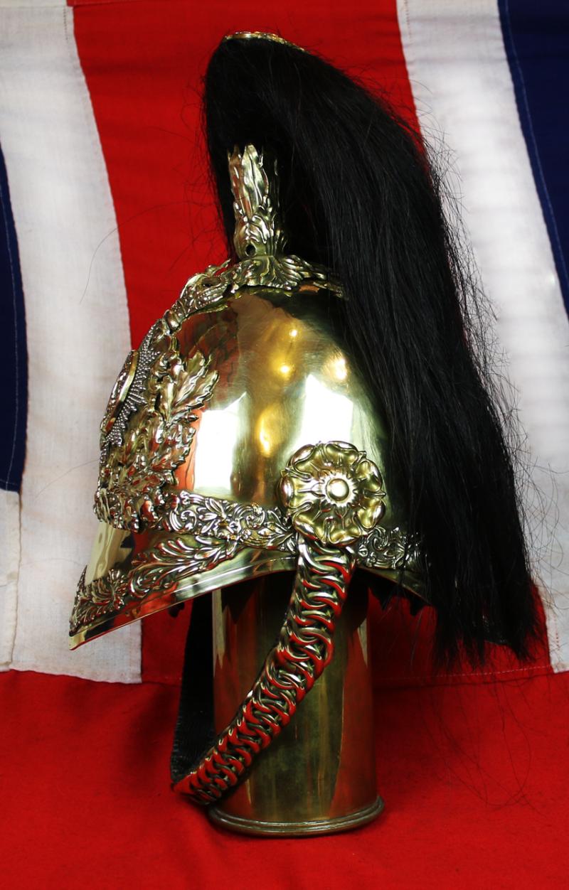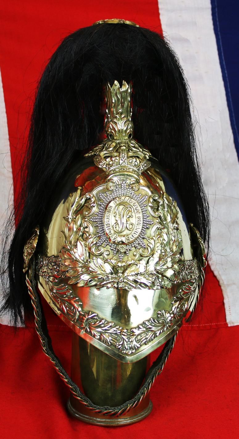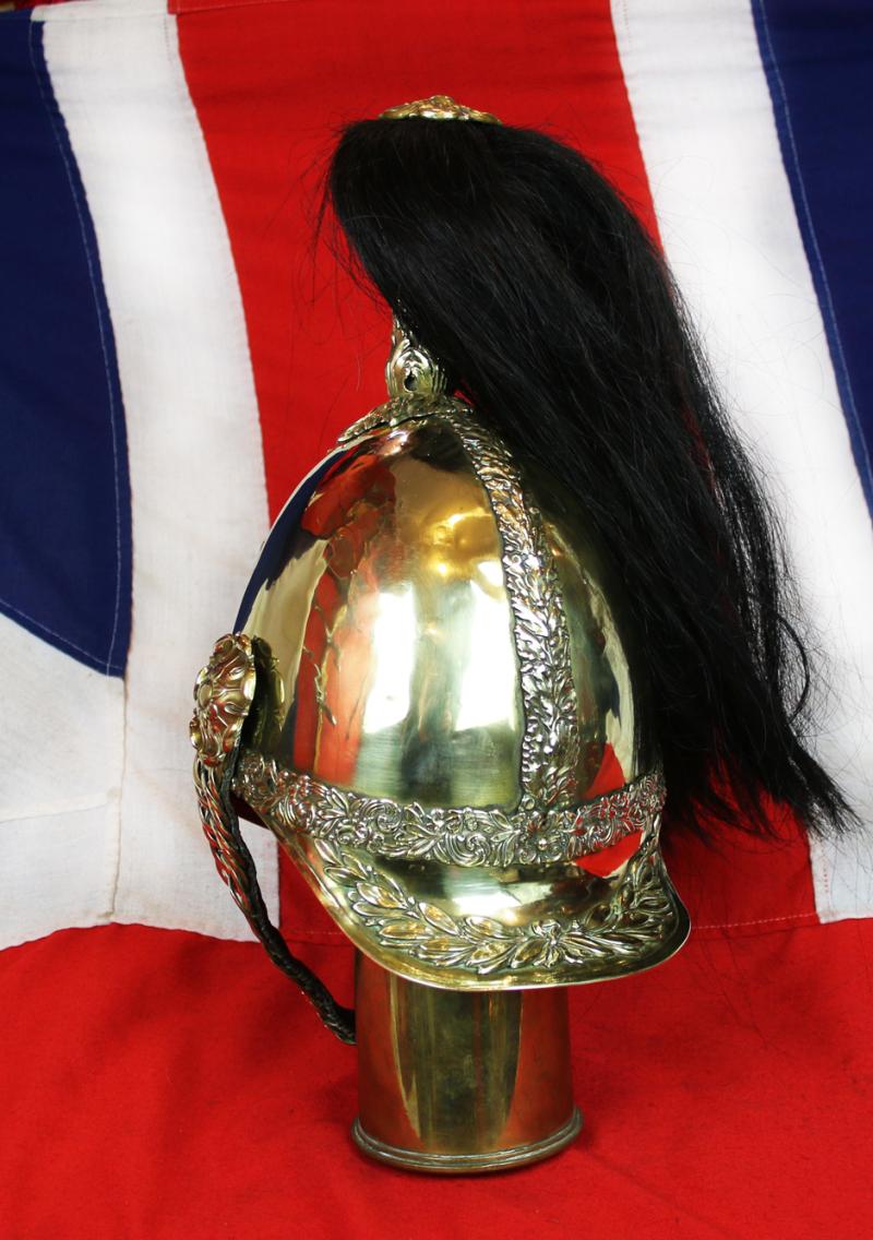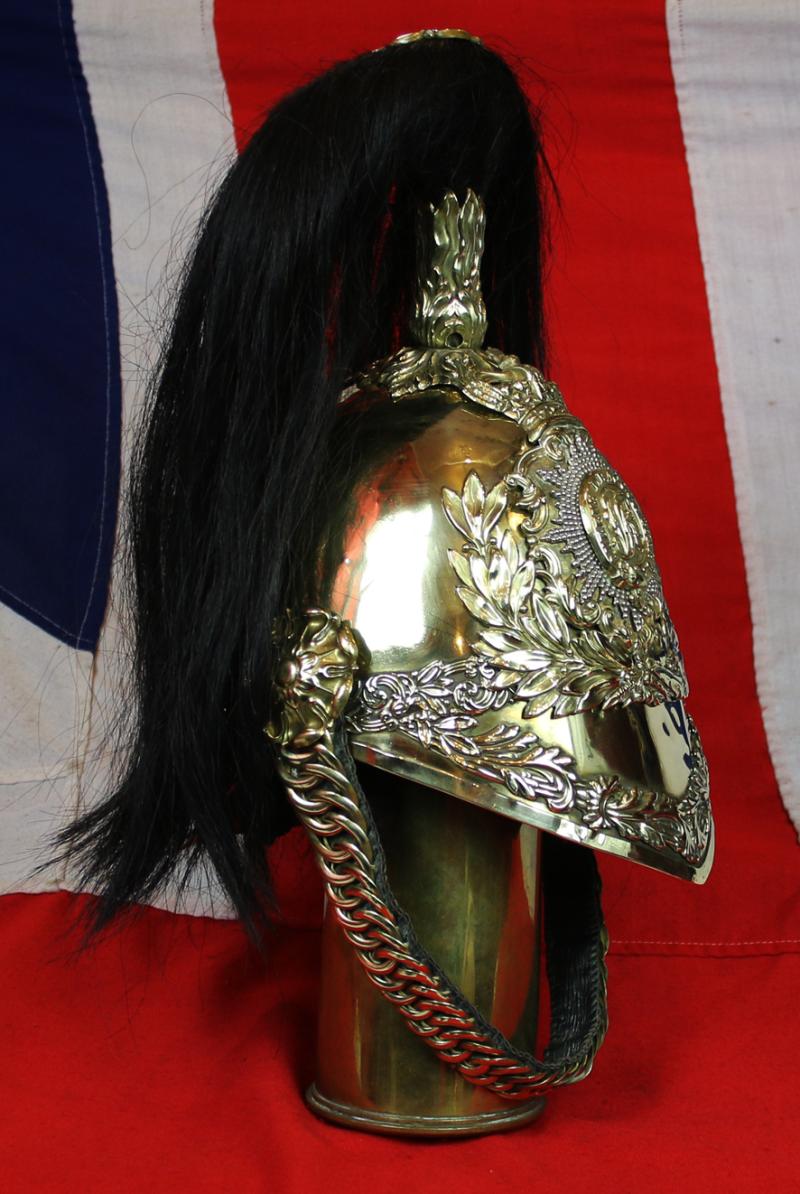 Whereas there are only a few officers helmets in existence of this vintage, other ranks' helmets are even rarer. This is a 2nd Dragoon Guards helmet with the correct black plume, and in overall good condition, the original plume has service wear.