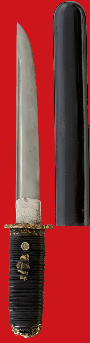 With cord bound hilt, over patinated copper metal figural mounts, gold inlaid pommel in a aoi leaf and vine patterning, gilt highlighted nicely chiselled iron sword guard, silver foil covered blade collar and single edged damascened blade.The whole design is very much in the Japanese taste, but with a Chinese form fixed hilt, unlike the Japanese dagger hilt which is removable. Black lacquer scabbard.