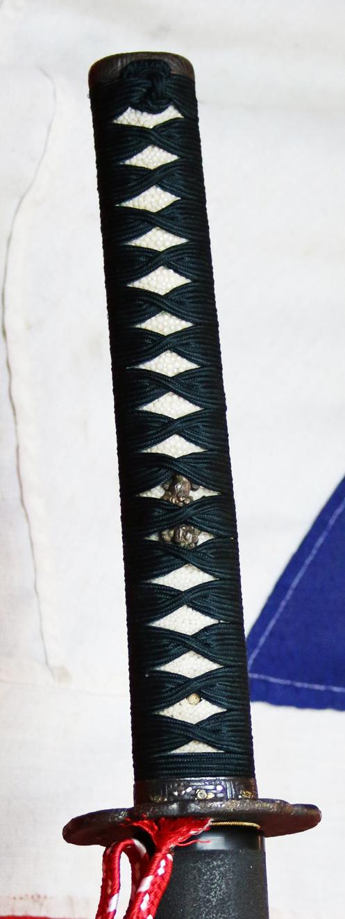 A large iron plate mokko tsuba with mimi, decorated with a village scene with gold highlights. the fuchi kashira are matching with a rattan screen pattern showing gold decorated blooms. a superb black isheme stone finish saya, and finest black tsukaito binding wrapped over fine menuki, and traditional samegawa {giant rayskin}.
