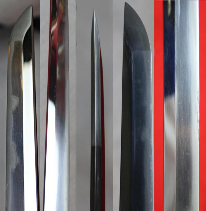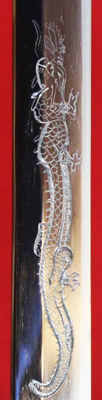 Horimono, a type of carving, often adds other decorative Horimono to the blade in addition to grooves. The properties of horimono are usually traditional images, such as swords, dragons, deities, Buddhist patterns, bonji, Chinese characters, and so on.Among the blades of the Koto period of sword manufacture (1600), many of the carvings display religious meaning: Bonji (sanskrit), Su-ken, Fudo Myo-o,Kurikara, Sanko-tsuki-ken, Goma-bashi, Hachiman-daibosatsu, Namu-myoho-renge-kyo, and Sanjuban-shin.In the Shinto period of swordmaking (1600), the carvings become more decorative with depictions of cranes and turtles, ascending and descending dragons, shochikubai (pine, bamboo and plum), and the deity of wealth, Daikoku.These images are carved with hammers hitting small chisels of various sizes. The internal surface of horimono is ground smoothly and finely, and polished during the polishing process. Making horimono is both difficult and time-consuming; Swordsmiths mostly carve grooves and simple Sanskrit characters themselves, while the more magnificent horimono is made by specialized craftsmen. After deciding which image to use, carefully draw a detailed pattern with a brush at the position to be carved, and then complete the horimono. The ideal horimono has a moderate proportion, the size matches the word to be carved, and is engraved in the appropriate position