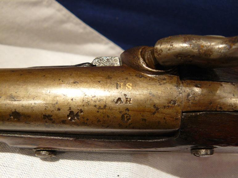 Made in Middleton Connecticut by either Simeon North or Robert Johnson. The breech is marked in three lines with US / AH / (circle) P. The P proof mark is in a depressed rosette. The inspector initials AH are those of Asabel Hubbard who was a Springfield Armory armourer and contract arms inspector.