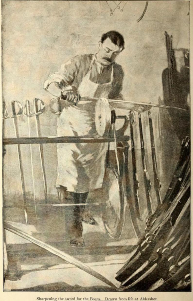 Pictures in the gallery of photographs of the regimental armourers sharpening their 1885 cavalry swords before combat.