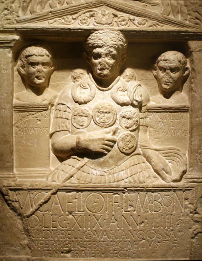 The tombstone of Marcus Caelius who was the First centurion of the 18th Legion. His brother set up this monument to commemorate his death in the ‘bello Variano’, he is wearing his military gallantry award Armilla above his right wrist. See photo 7 in the gallery.