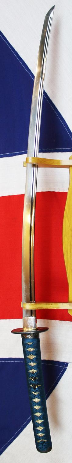 The blade is absolutely beautiful, with hirazukuri, iori-mune, very elegant zori, chu-kissaki and carved with broad and deep hi on both sides, the forging pattern is beautiful, and a gunome-midare of ko-nie, deep ashi, hamon, the tang is original, and full length, and it is mounted with a silver habaki. The blade has a fabulous blocking cut on the mune, a most noble and honourable battle scar that is never removed and kept forever as a sign of the combat blocking move that undoubtedly saved the life of the samurai, and will thus be never removed.
