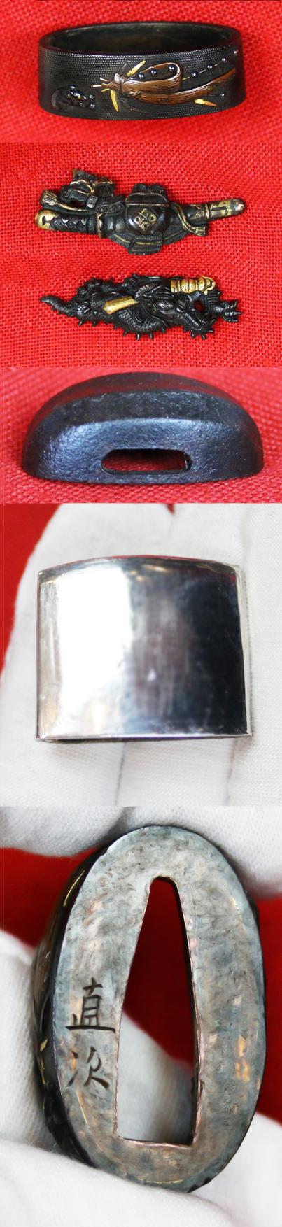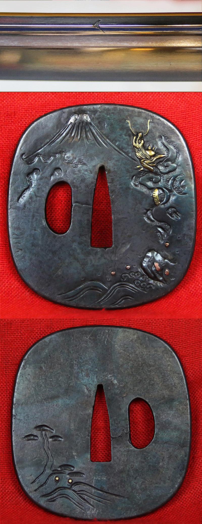 Its tsuba is beautiful with a takebori design of Mount Fuji with dragon flying in the sky above, with highlights in gold, silver and copper. The Edo menuki are of a shakudo and gold representation group of samurai armour upon a tachi, and a shakudo and gold dragon {clutching an ancient Ken double edged straight sword with lightning maker} a Edo Antique Ken maki Ryu zu