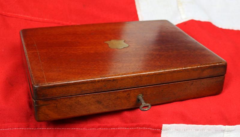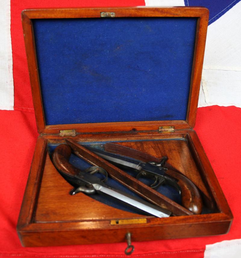 Overall blued with light natural aged russet surface beneath, both actions are tight with good springs, one action fires well on double cocking, the second just on first cocking. The walnut box is good, with some old surface scratching, key lock works well.