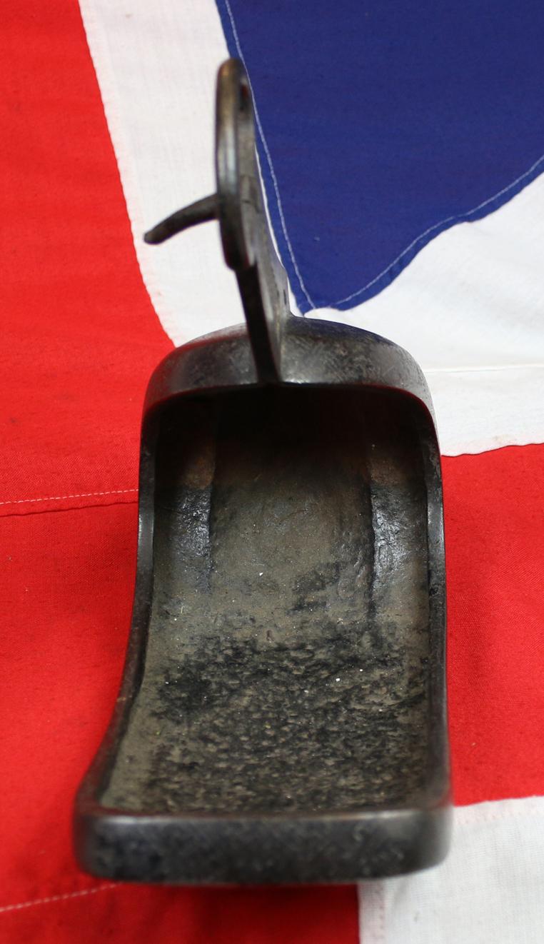 This Japanese stirrup, is made in the traditional dove's breast (hato mune) shape with an open platform lined slightly curved forward so that the foot fits in without sliding backwards. In the front extremity the stirrup has a rectangular buckle with several horizontal slots which also serve as a handle.