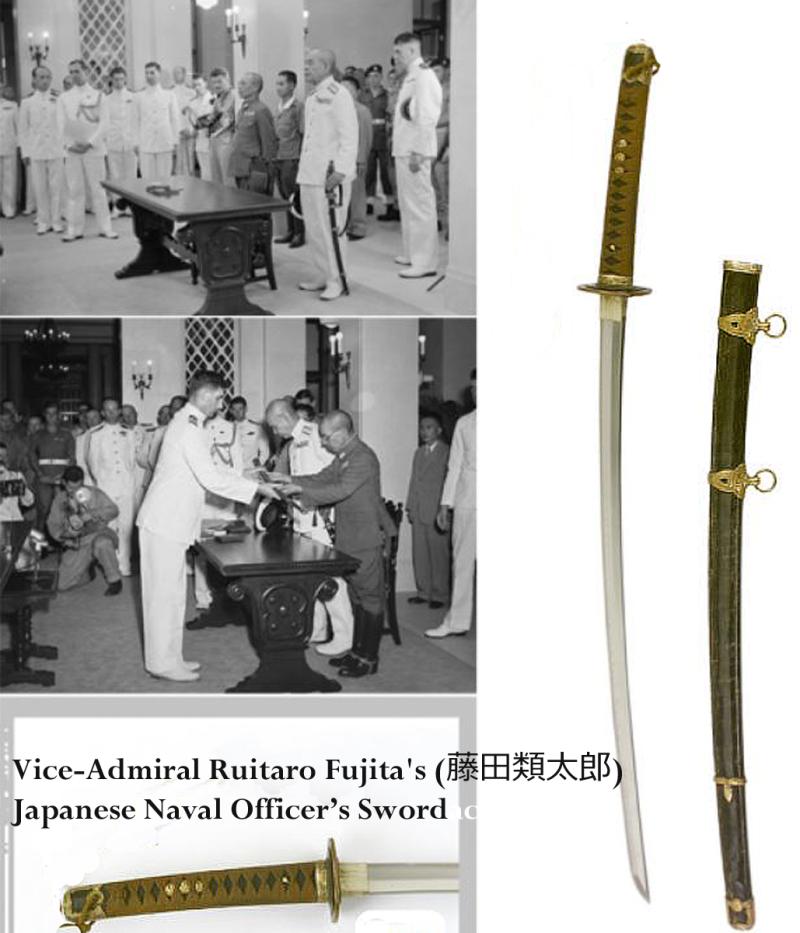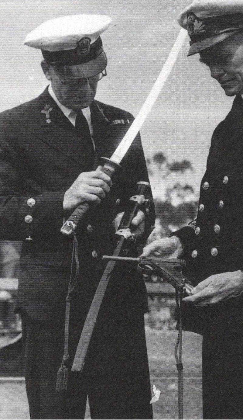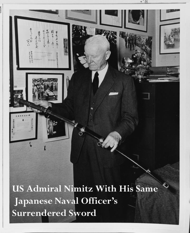 Photo of a Japanese Naval Officer’s sword type examined by commonwealth naval officers after capture. Plus another showing Admiral Nimitz admiring his identical sword, and Admiral